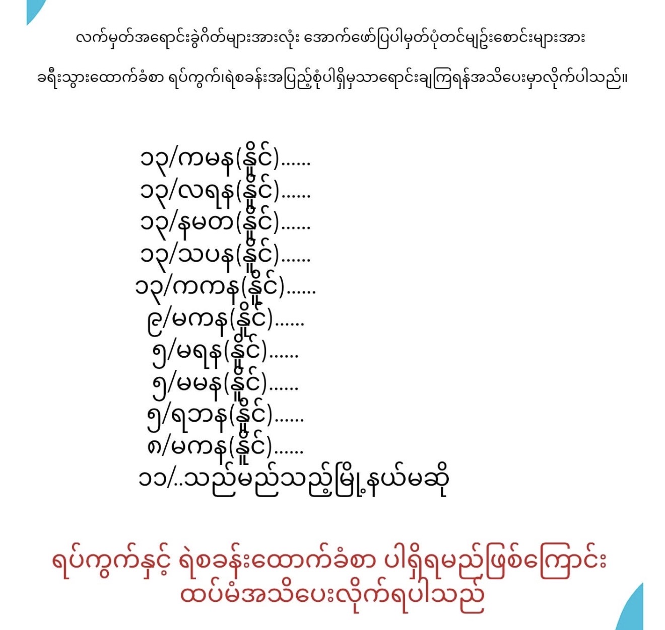 မကြာခင်ပိတ်ရက်အတွင်း ခရီးသွားလာမည့် ခရီးသွားမိဘပြည်သူများအနေဖြင့် အောက်ပါ မှတ်ပုံတင် မျဉ်းစောင်းများသည် ခရီးသွားလာမည်ဆိုပါက မှတ်ပုံတင်မူရင်းအပြင် ရပ်ကွက် နှင့် ရဲစခန်းထောက်ခံစာ လိုအပ်ပြီးရပ်ကွက်ထောက်ခံစာ ရဲစခန်းထောက်ခံစာ တပတ်ကြိုတင်ပြုလုပ်နိုင်ပါရန် အကြောင်းကြားထားကြောင်း သိရပါသည်။